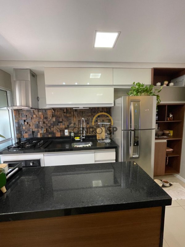 Porcelanato, detalhamento em pedra ferro, Cooktop/ Forno e Coifa embutidos